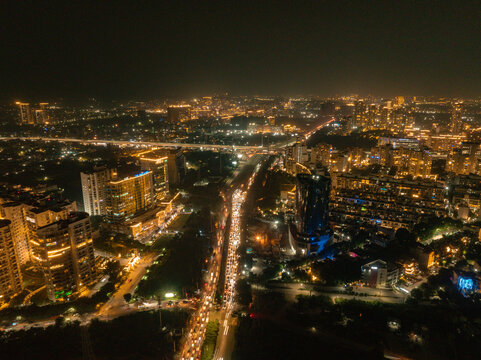 Aerial view of glittering towers piercing the night sky, their lights casting a warm glow over the cityscape, Golf Course Extension Road, Gurugram, Haryana, India.