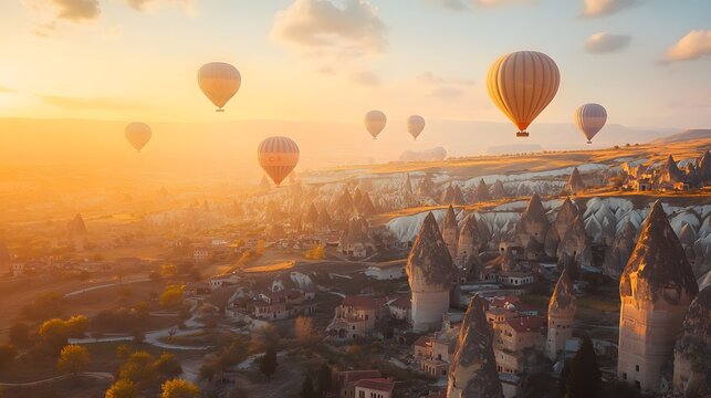 Hot air balloons soar over Cappadocia during a vibrant sunrise showcasing unique fairy chimneys