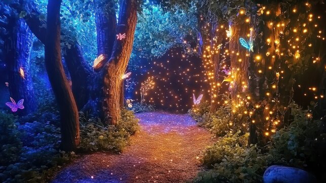 Magical forest path illuminated by glowing fireflies, creating a mystical and enchanting ambiance in the dark woods.