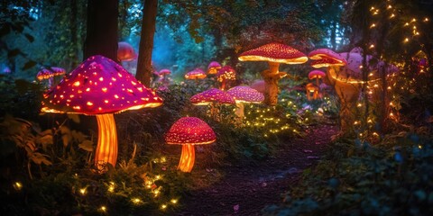 Fairyland filled with glowing mushrooms and twinkling lights, enchanting scenery,