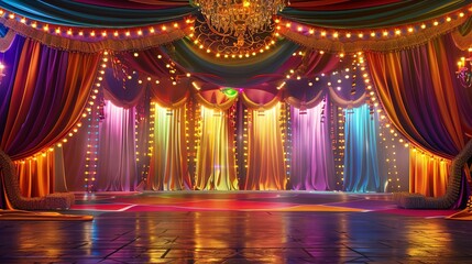 Vibrant Circus Stage with Dazzling Lights and Colorful Curtains