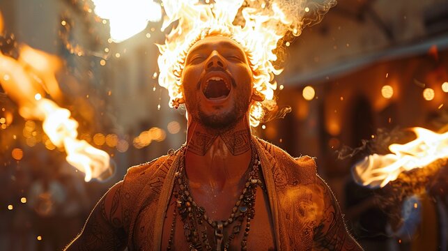 fire show fire blowing performance dancing with flame male master fakir with fire works on street arts festival fire breathing trick.