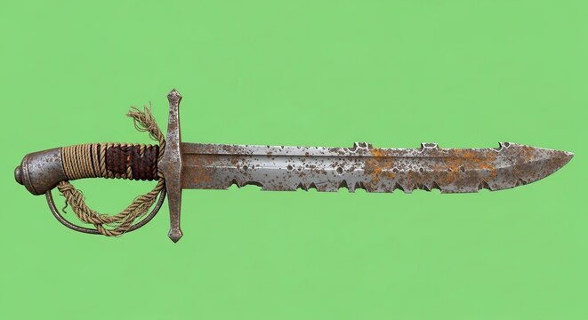 Aged Pirate's Cutlass with a Rusted, Jagged Blade and Rope-Wrapped Hilt on Green.