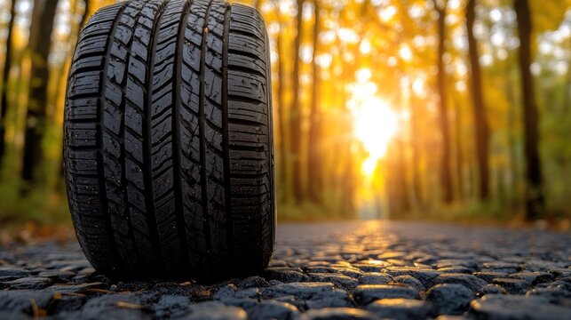 Used tire on autumn road at sunset.
