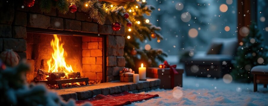 Cozy christmas tree by fireplace with festive decorations