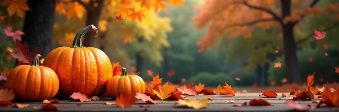 Vibrant festive fall scene with pumpkins and colorful autumn leaves, fall, thanksgiving, celebration