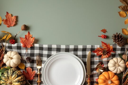 Gorgeous fall table arrangement.Top view photo of plate, cutlery, checkered napkin, tablecloth, raw pumpkins, maple leaves on olive background with empty space for promo or text