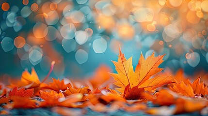 Orange maple leaves on the ground with a bokeh effect defocused background