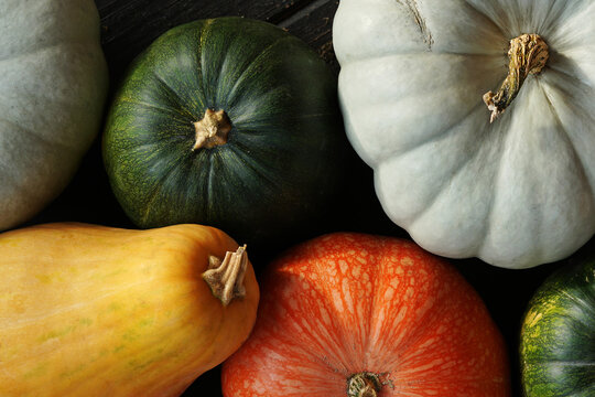 Diverse assortment of pumpkins on a wooden background. Autumn harvest.