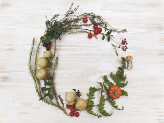 Festive autumn Thanksgiving wreath with pumpkin, fern, physalis, red berries and heather, on rustic background. Autumn holiday, fall, Thanksgiving, Halloween concept. Flat lay, top view, copy space