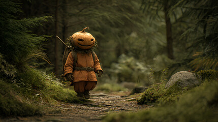 Eerie pumpkin lit path winding through forest