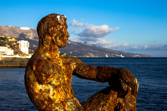 A rusty brown statue of a man falling apart and abandoned against the backdrop of nature, the sea and the mountains. Metal sculpture the whole covered with rust.