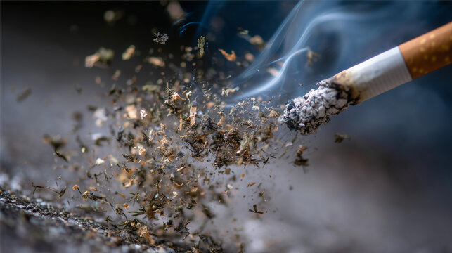 Say no to smoking. Cigarette ashes falling from a burning tip, with smoke trails in the background. Burning cigarette.