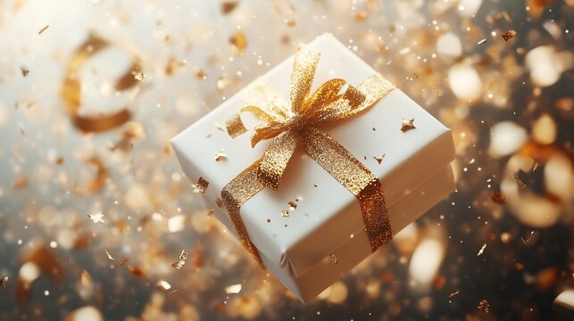 Man with glasses celebrating as colorful confetti and cardboard boxes fall around him