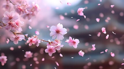 Delicate cherry blossoms falling gracefully in a gentle spring breeze creating a serene and romantic scene with soft pink petals drifting through the air and a blurred atmospheric background