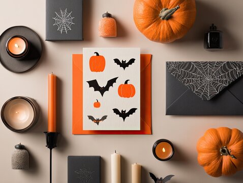 Halloween flat lay pumpkins, bats, card, candles, and envelope