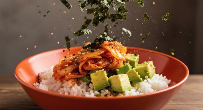 Kimchi Avocado Rice Bowl with Falling Seaweed Flakes in an Orange Bowl
