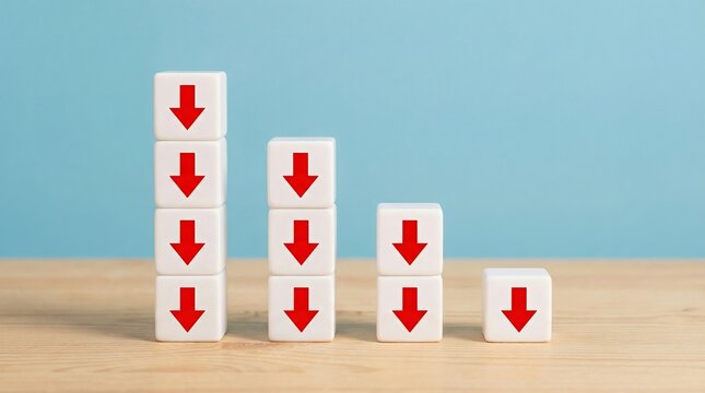 Stacked cubes with red arrow down symbols showing step by step decreasing trend and negative growth