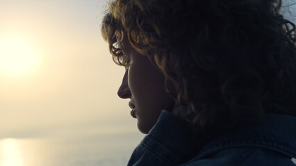Relaxed girl dreaming on beach at sunrise. Pensive woman enjoying sea horizon