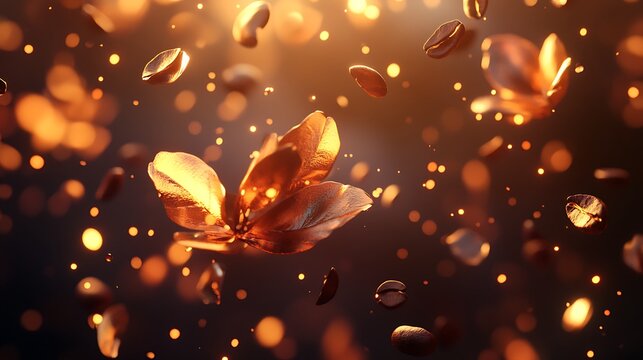 Glowing orange bokeh with falling snowflakes creating winter holiday ambience and warmth