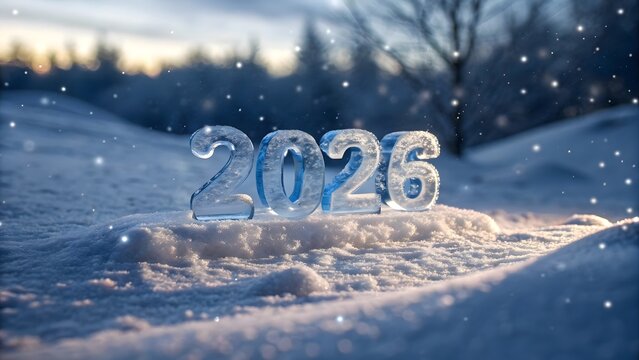 Shiny silver 2026 numbers with falling snowflakes and bokeh lights