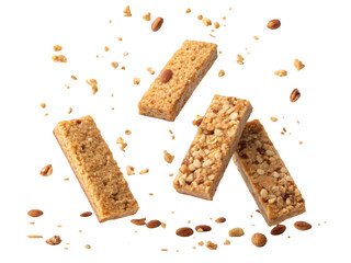 Fresh long brown rice, uncooked and hulled falling on transparent background
