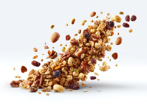 Dynamic studio shot of crunchy granola flakes and fresh blueberries falling into a white bowl, creating an energetic splash of creamy milk, symbolizing a healthy and vibrant breakfast