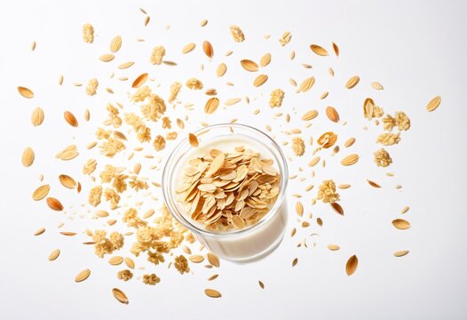 Falling Oat Flakes with Milk Splash, Isolated on transparent Background