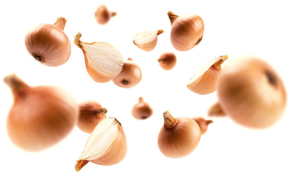 Flying or falling onions on transparent PNG or white background. purple onion rings.