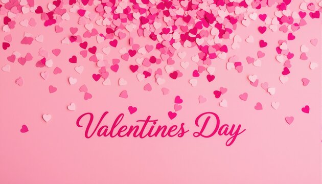 Valentines day card. Heart confetti falling over pink background for greeting cards, wedding invitation.