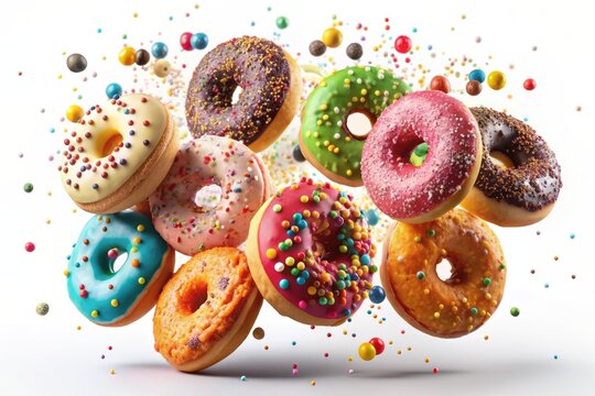 Vibrant, sprinkled donuts in assorted colours and decorations falling in mid-air, isolated on a white background, creating a playful, sugary, and dynamic panorama banner.
