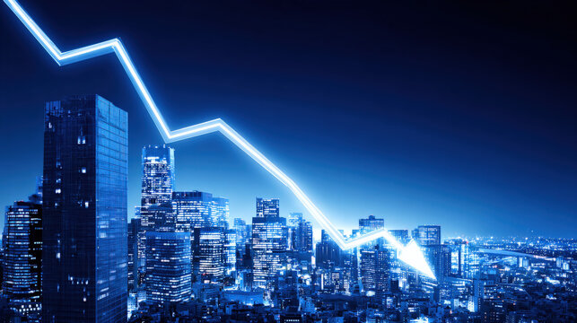 blue downward trend line overshadowing faint city skyline silhouette economic recession visualization illustration concept scene visual for commercial design use high detail quality stock image