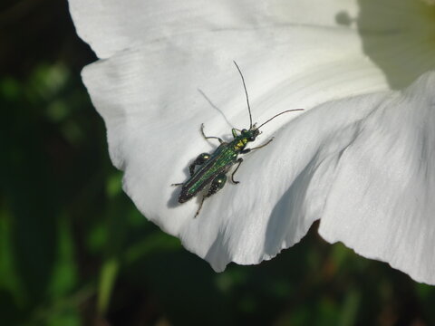Thick-legged flower beetle (Oedemera nobilis), also known as swollen-thighed beetle, male on a white bindweed flower