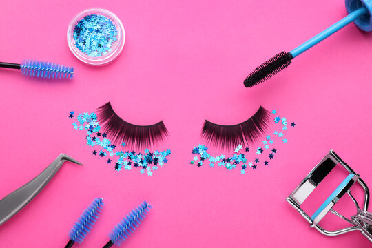 Composition with false eyelashes, mascara and eyelash brushes, eyelash curlers on a lilac background. Makeup artist tools. Beauty concept. Compose. Place for text. Place to copy. Flatley. MOCAP.