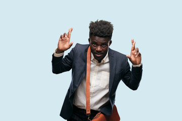 Superstitious businessman crossing fingers for good luck, hoping to win, fortune