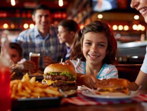 Joyful Family Dining: Happy Parents and Kids Enjoying Delicious Burgers and Fries in Stylish Diner Setting