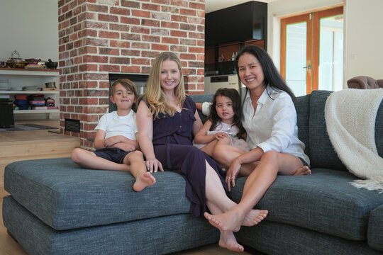 A happy family of four is gathered on a comfortable sofa, sharing laughter and warm smiles. The cozy living room setting reflects a sunny afternoon filled with love and togetherness