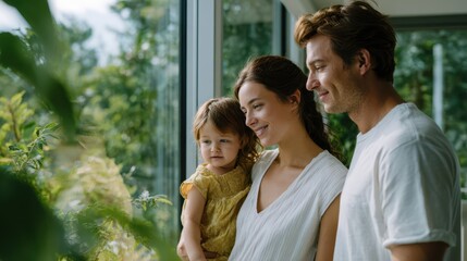 Happy young family standing by large window at home, smiling while looking outside surrounded by greenery and natural light in peaceful eco-friendly setting