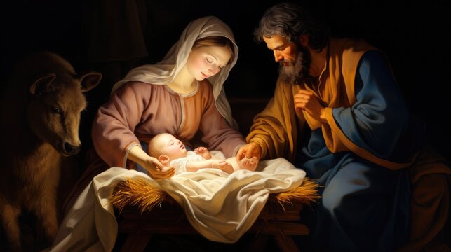 Holy family with baby jesus in the crib in style of raffael baroque painting, christnight
