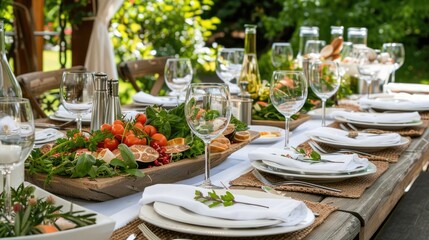 A wooden table set for a summer dinner party with white plates, silverware, and glasses, featuring a centerpiece of fresh tomatoes, herbs, and citrus fruits