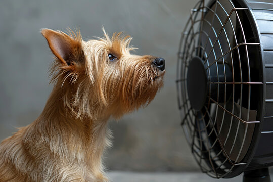 Domestic cat sitting in front of fan on living room during summer heat