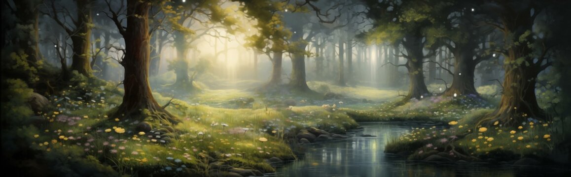 Glowing abstract forest landscape, fantasy dreamscape illustration