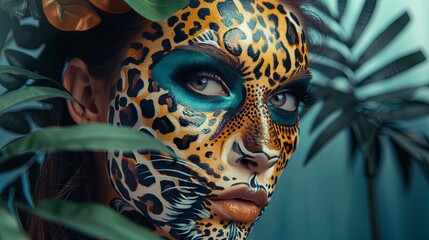 Woman with black body paint. Cheerful young african girl with art bodypaint. An amazing model with yellow and red makeup. Closeup face with copy space.
