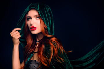 Photo of gorgeous lady touch hood green cloak cape feel look tempting teasing isolated dark blue color background