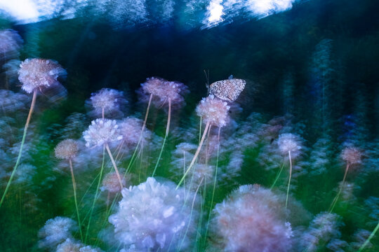 Ethereal butterfly on flowers in a blurred fine art style