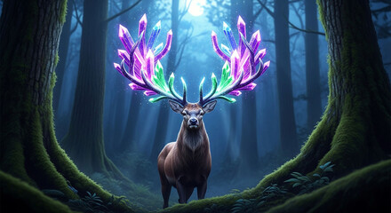Deer with crystal antlers in magical forest wildlife fantasy art mystical stag nature woodland ethereal scene