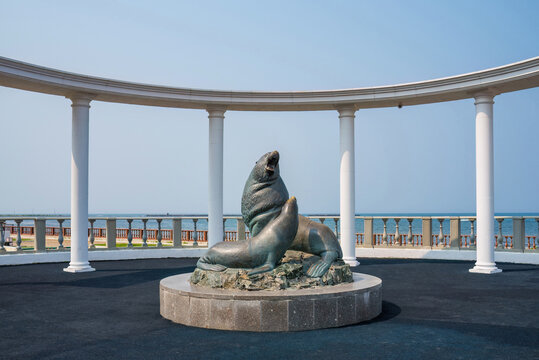Steller sea lions sculpture on the embankment of Nevelsk, Sakhalin Island. Northern sea lions are the official symbol of the city. Landmark and monument in the Russian Far East