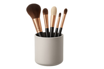 Makeup brushes set in ceramic holder on transparent background