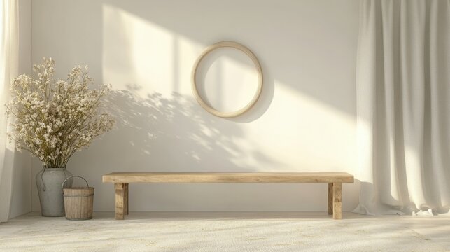 home interior in foryer area in front of room with wooden bench ,plant, bucket, hook,hanger,floor lamp,fabric,empty frame on white wall ,carpet and curtain in farm house style 3d render