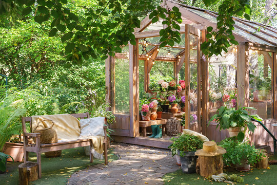 Charming wooden greenhouse with blooming potted hydrangeas and vibrant green plants, surrounded by summer foliage, under string lights in backyard garden background. Plant breeding, gardening hobby
